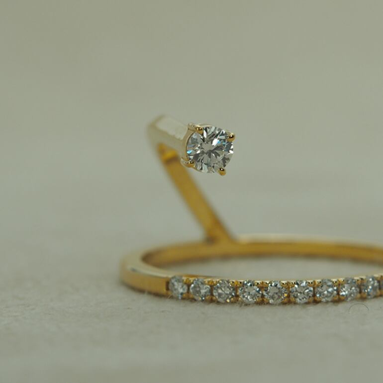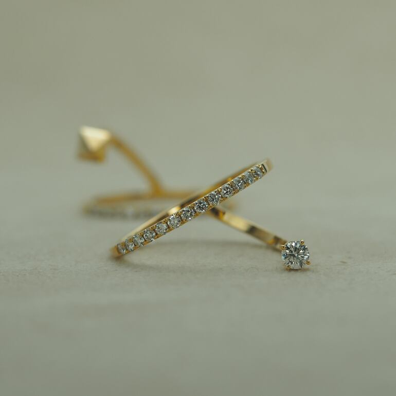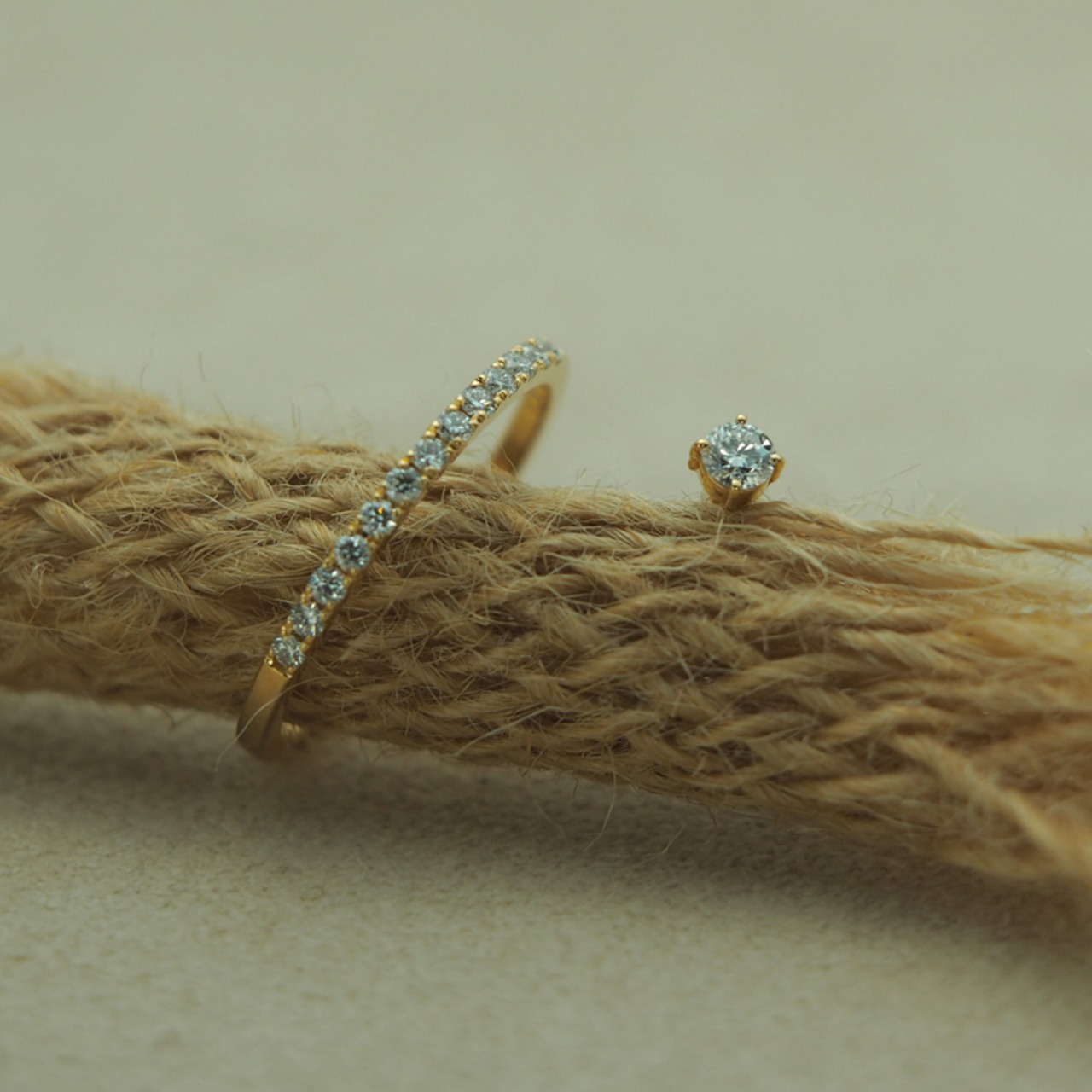 指の隙間から顔を覗かせるダイアモンドがユーモアなサトルリングは同じデザインのスタッドタイプと重ね着けることが出来ます。チラリと見えるダイアモンドとエタニティダイアモンドがモダンな印象を与え、角度を変えるたびに異なる表情を見せる、遊び心のあるデザインです。