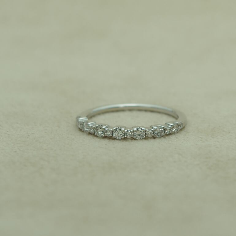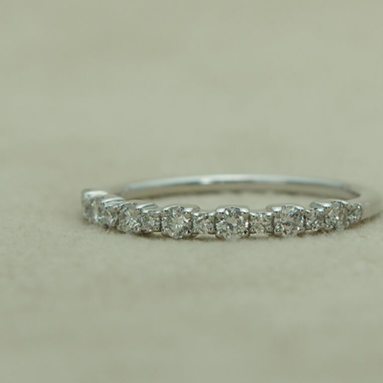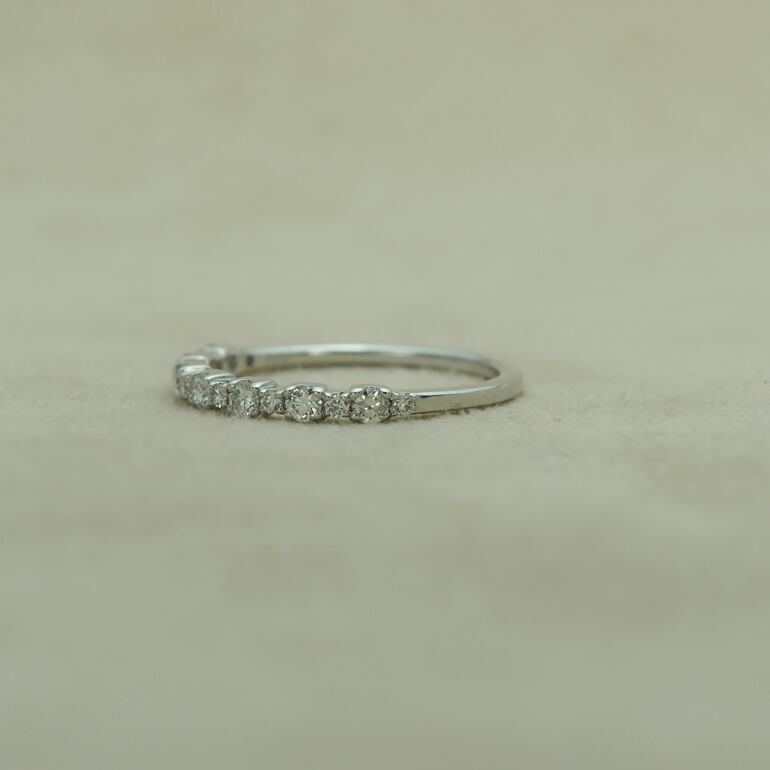 均一なダイヤモンドの列ではなく、大小のダイヤモンドが互い違いに配置されることで、光を受けるたびに複雑でリズミカルなきらめきを生み出します。まるで光の粒が指の上で踊っているかのような、見る角度によって表情を変える繊細な輝きは、飽きることなく、永くお楽しみいただけます。スタンダードなエタニティリングの上品さにキュートさがプラスされた特別なエタニティリングです。