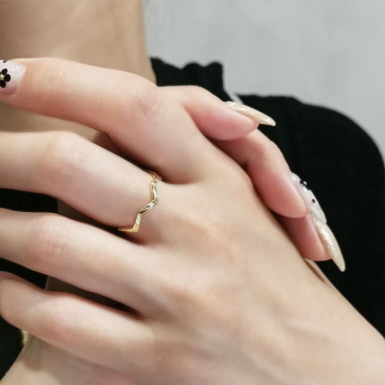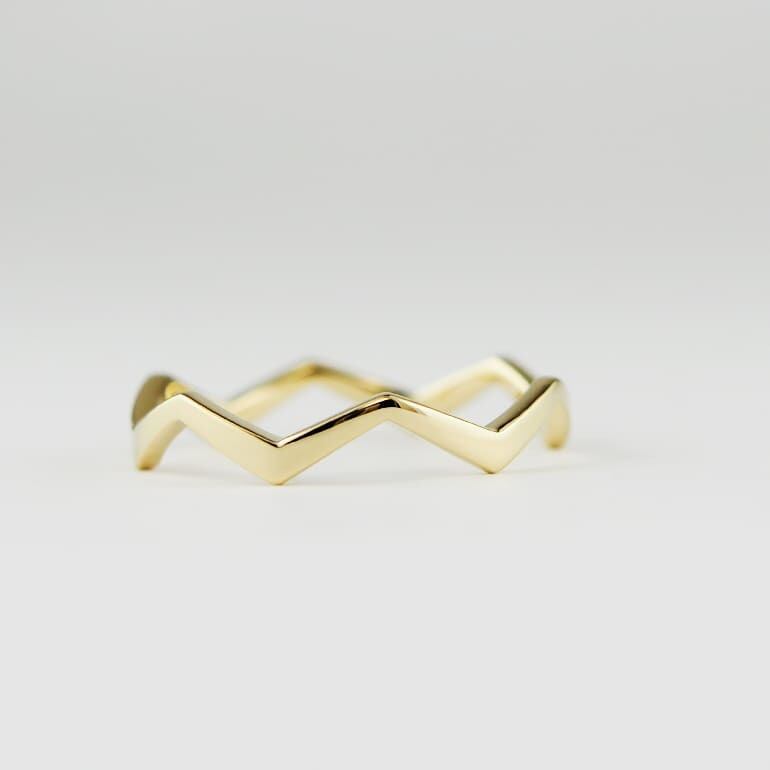 全周をジグザグにデザインしてスタイリッシュな仕上がりに制作しました。表面のゴールドの輝きがエッジラインと調和して美しい直線美を演出しています。同じシリーズのダイアモンドがセッティングされたタイプと重ね着けしていただくとより華やかな指元にアレンジ出来ます。