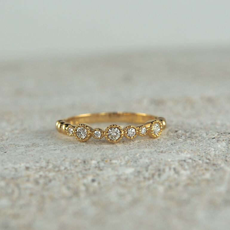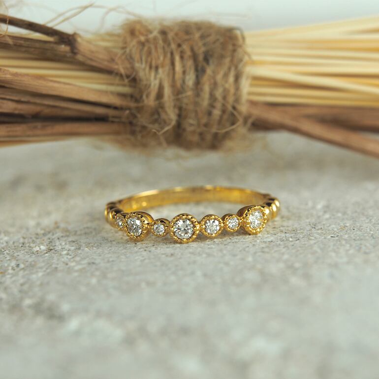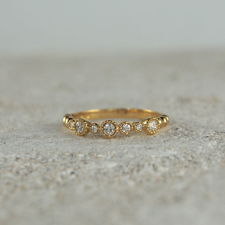クラシックな雰囲気漂う、ダイアモンドの指輪が登場しました。煌めくダイヤモンドが上品な輝きを放ち、アンティークなデザインが大人の魅力を引き立てます。特別な日や普段使いにもぴったりな一品です。大小あるダイアモンドをミル打ち加工で取り囲んだ遊びいっぱいの華やかな指輪です。