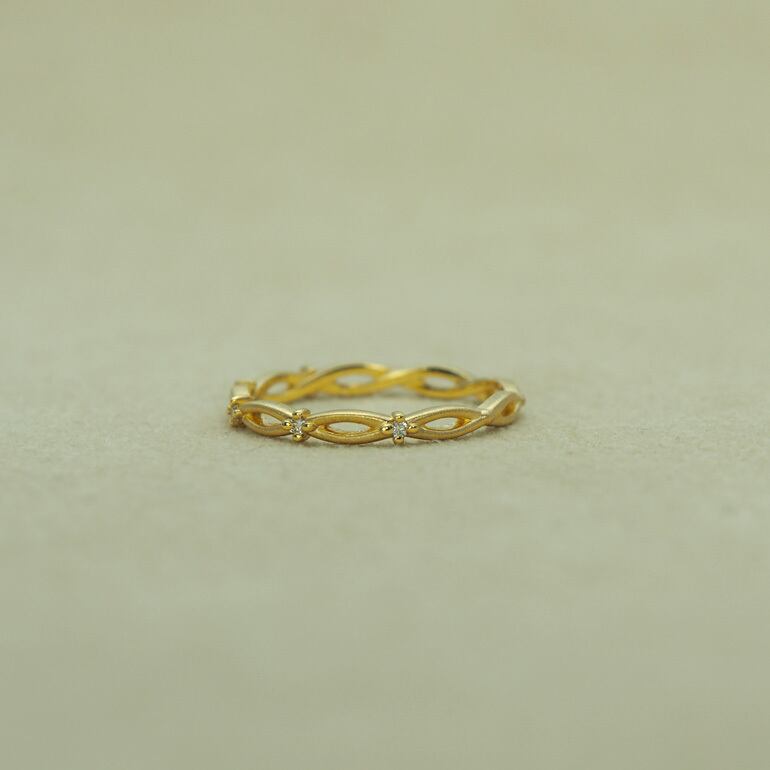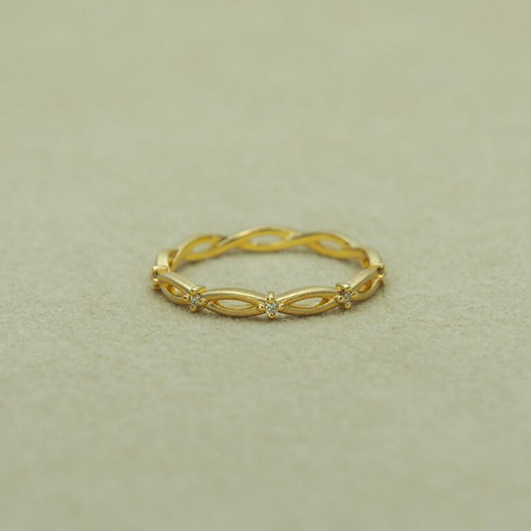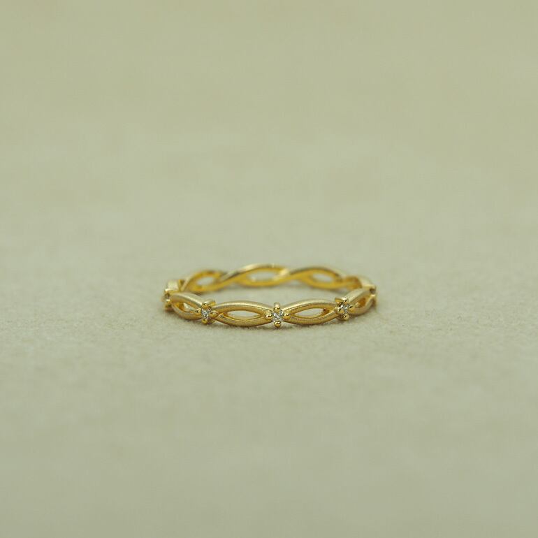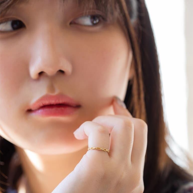 人と人との出会いをイメージしてデザインした上品で繊細なピンキーリングは永遠に続く人との縁を表しています。全周に施された交差するデザインに正面にはダイアモンドを3石セッティングされ、表面をヘアーライン仕上げすることでダイアモンドとのコントラストを楽しむことが出来ます。
