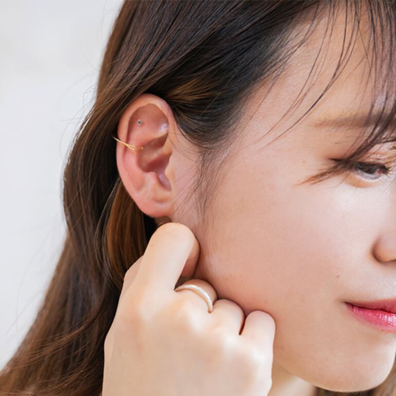 耳の厚さに合わせて挟んで調整すれば落ちにくくホールドします。上下左右逆したり、着ける位置を変えることで色々な楽しみ方が出来るイヤカフは今ではオシャレのマストアイテムです。他のピアスやイヤーカフと組んだり左右のバランスを変えアシメの雰囲気で存在感を変えると同じアイテムでも表情が違って見えます。
