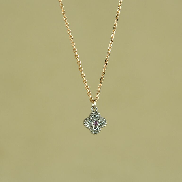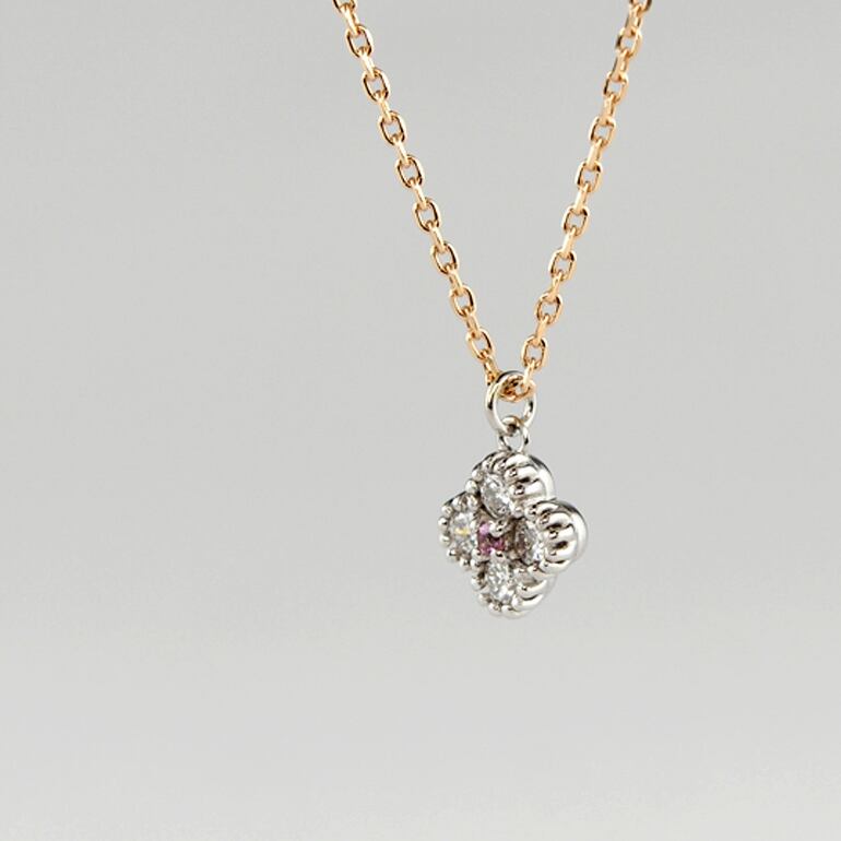 センターのピンクサファイアをダイアモンドで囲んだフェミニンなデザインです。可愛い色合いながらもクラシカルな雰囲気で高級感もあるネックレスになっています。