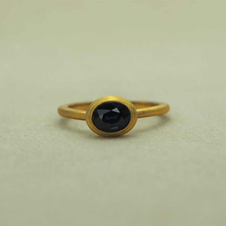 イエローゴールドの輝きと、ブルーのサファイアが美しく輝く色合いのコントラスト。二重の輪が指元に上品な存在感をプラスしてくれます。シンプルでありながらも、どこかエレガントで洗練されたデザインは、日常使いはもちろん、華やかなシーンにもオススメです。