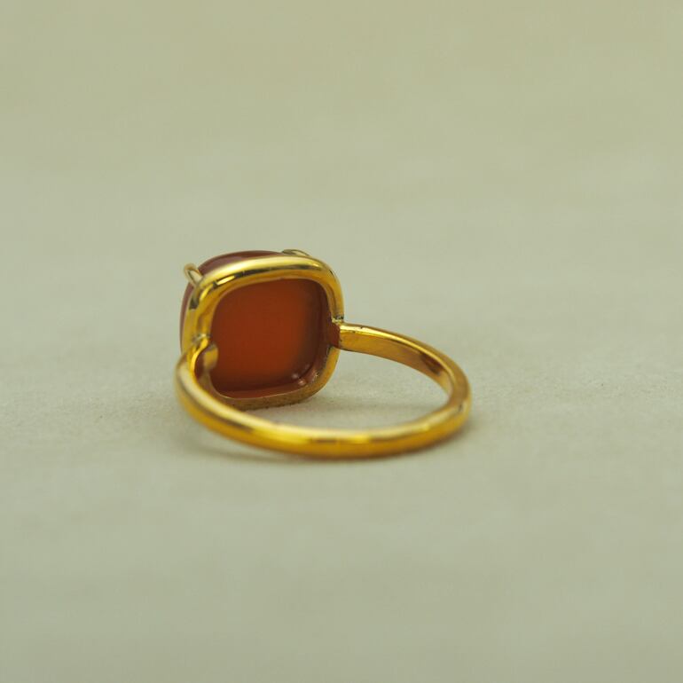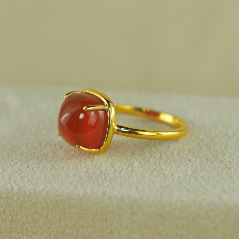 角砂糖が生まれる前の砂糖の形は円錐型でした。そこから名づけられたシュガーローフカット。そのシュガーローフカットの瑪瑙が美しく輝くリングです。イエローゴールドの煌びやかな輝きと相まって、存在感抜群の大振りデザインが個性を際立たせます。瑪瑙は古くから幸運や愛を象徴する石として親しまれており、身に着けることでポジティブエネルギーを引き寄せると言われています。