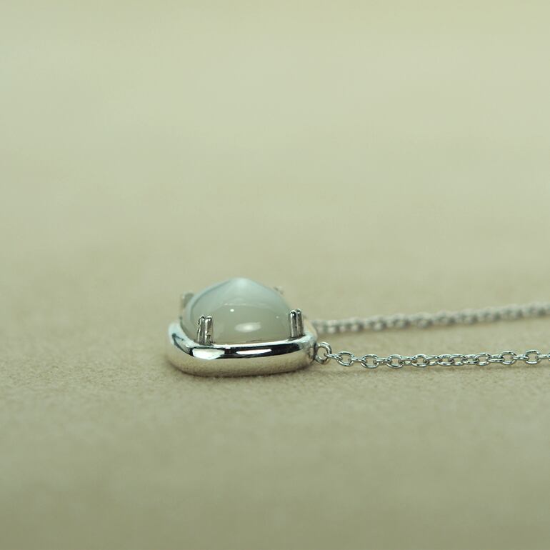 優しい光ととろけるような色合いが魅力のネックレスです。ミルキークォーツの優しい色合いとシルバーの輝きが、どんなコーディネートにも華やかさをプラスしてくれます。角砂糖が生まれる前の砂糖の形は円錐型でした。そこから名づけられたシュガーローフカット。ミルキークォーツのパワーがあなたを包み込み、穏やかな気持ちを与えてくれるでしょう。