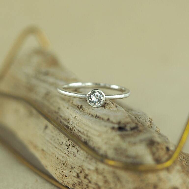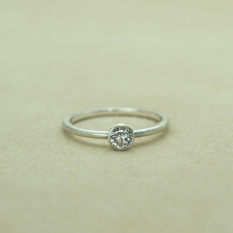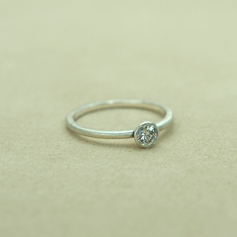 シンプルで華奢なデザイン。ダイアモンドを覆輪留めをして、シンプルに華奢なアームでリングにされたデザインは、ヘアーライン仕上げで艶消し加工されているのでどんなコーディネートにも馴染みます。マットな質感がモダンで上品な印象を与え、シンプルながらも存在感を放つリングです。