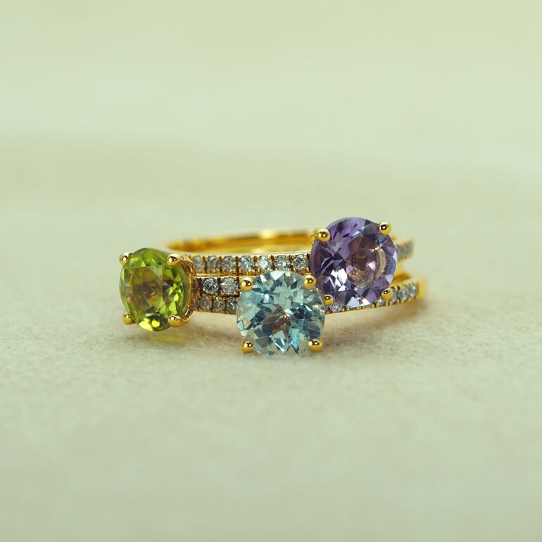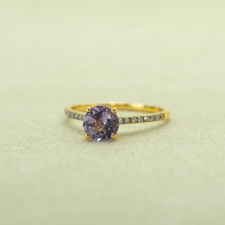 アメジストの深い紫色が美しい、レイヤードデザインの指輪です。丸いカットが光を反射し、指先をやわらかな輝きで彩ります。アメジストは、心を穏やかにし、智慧や平和をもたらすと言われるパワーストーン。身に着けることで、日常のストレスや疲れを癒やす効果が期待されます。繊細でありながら存在感も漂わせ、指元を華やかに彩ります。