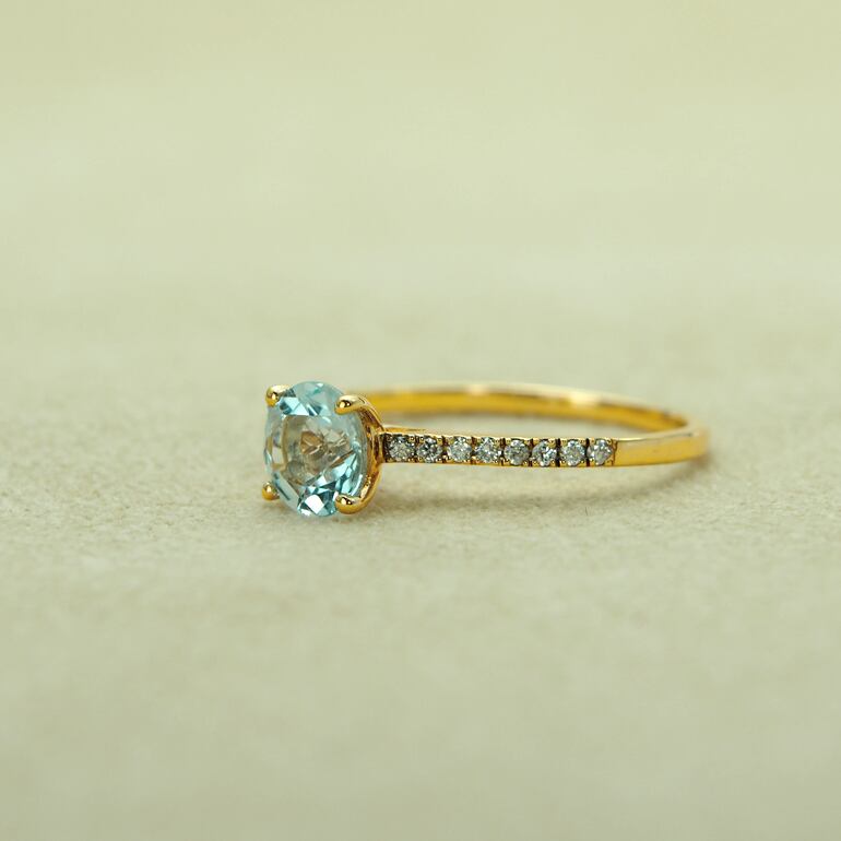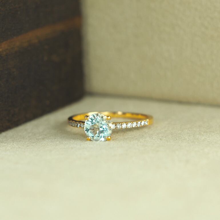ラウンドカットされた美しいブルートパーズが輝く、華奢でエレガントな指輪です。上品なブルーとシャープなダイヤモンドが絶妙なバランスを生み出し、指先を美しく引き立てます誕生石としても人気の高いブルートパーズ。その美しい輝きは、愛と平和を象徴し、着用者に幸せをもたらすと言われています。