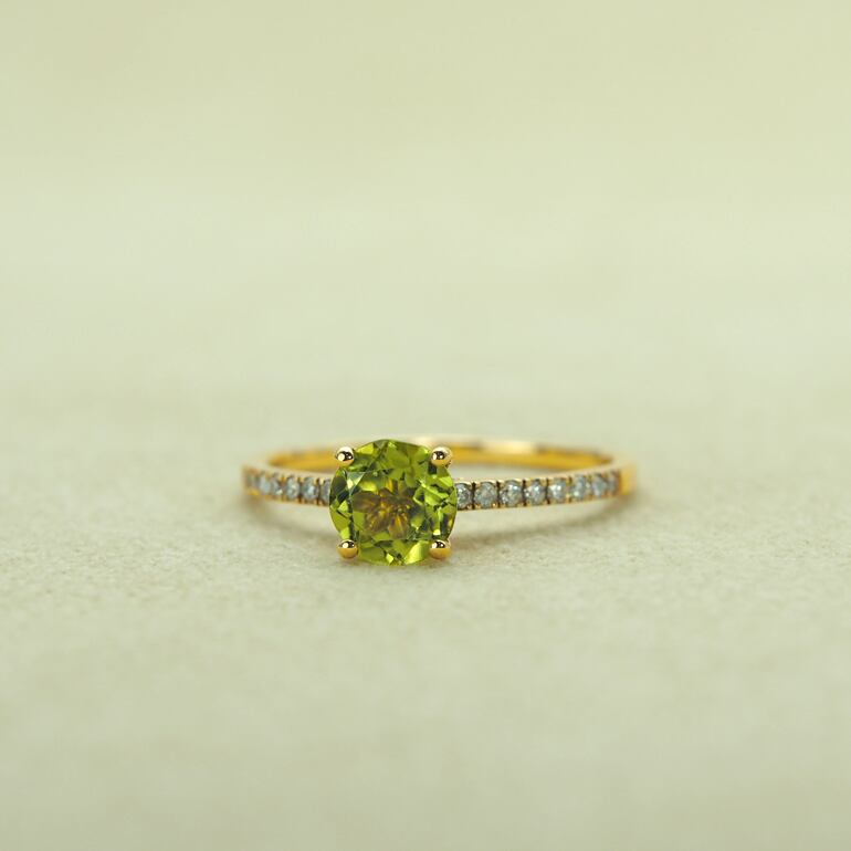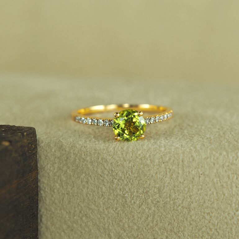 若草色のような鮮やかな黄緑色の洗練された輝きを放つペリドットリング。軽やかな印象のリングは、華やかな装いにぴったりのアクセサリーです。ペリドットは愛と癒しを象徴する宝石であり、身に着けることでポジティブなエネルギーを感じることができます。ダイアモンドの輝きと相まって、洗練された雰囲気を演出してくれるデザインです。