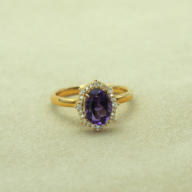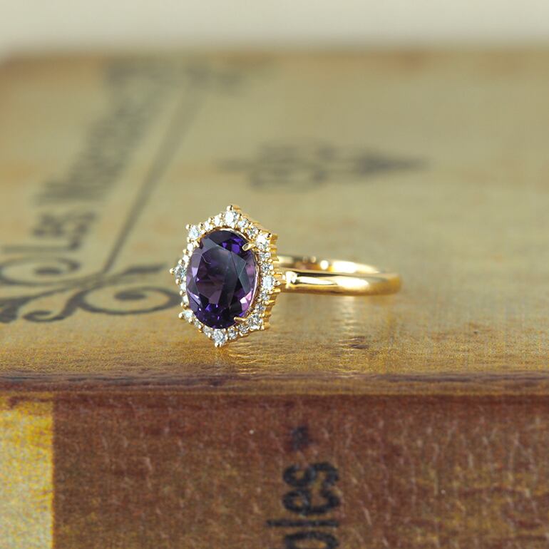 妖艶で美しいアメジストと輝くダイヤモンドが織り成す、エレガントなデザインの指輪。シンプルで上品ながらも、レースのようにダイアモンドを装飾されたデザインが華やかさをプラスしています。