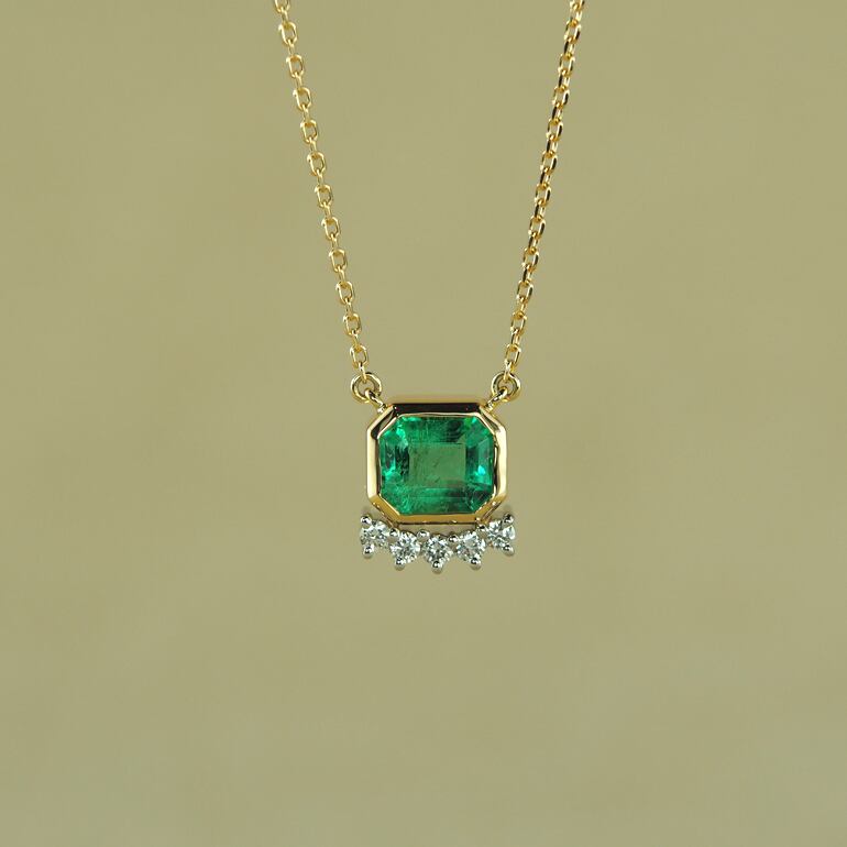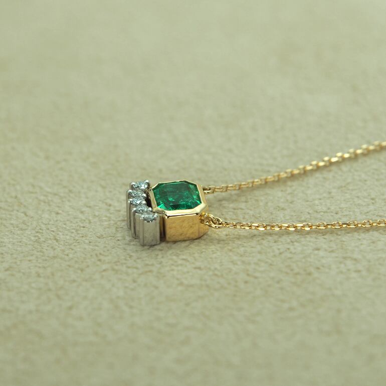 上品で透明感のあるエメラルドをシンプルにお仕立てしたネックレスです。エメラルドのサイズに合わせて職人が丁寧にお作りしたこちらのジュエリーは一点モノです。美しいエメラルドに付け合せられたさりげないダイアモンドがアクセントとなり華やかさを演出しています。