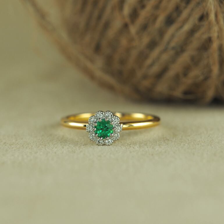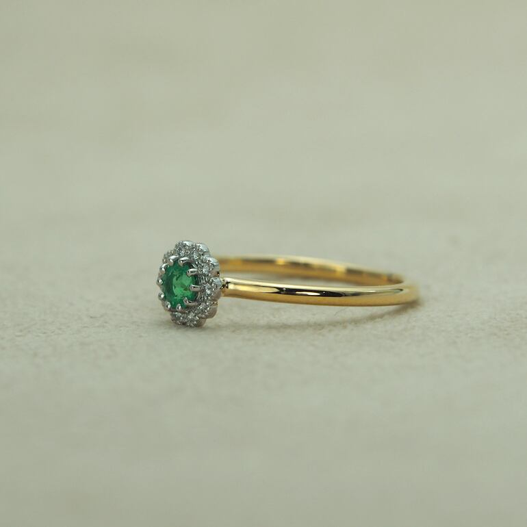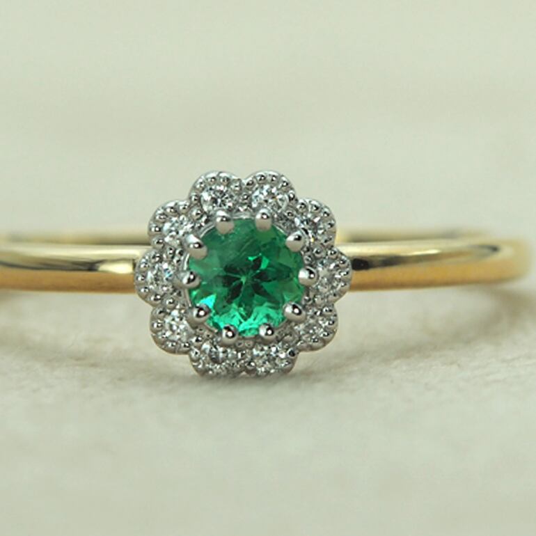 エメラルドではめずらしいラウンドカットを使用した魅力的な指輪です。上品なエメラルドの色合いとアンティーク感漂うデザインをプラチナとイエローゴールドのコンビネーションでお仕立てした特別なジュエリーです。ミル打ち「ミルグレイン」とは、小さな丸い粒を連続して打刻加工していく、中世ヨーロッパで古くから伝わる装飾技法のひとつです。