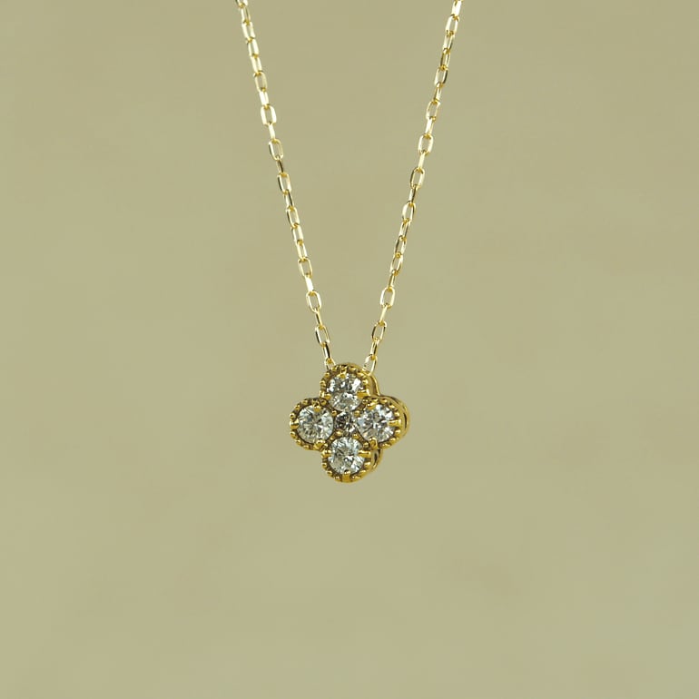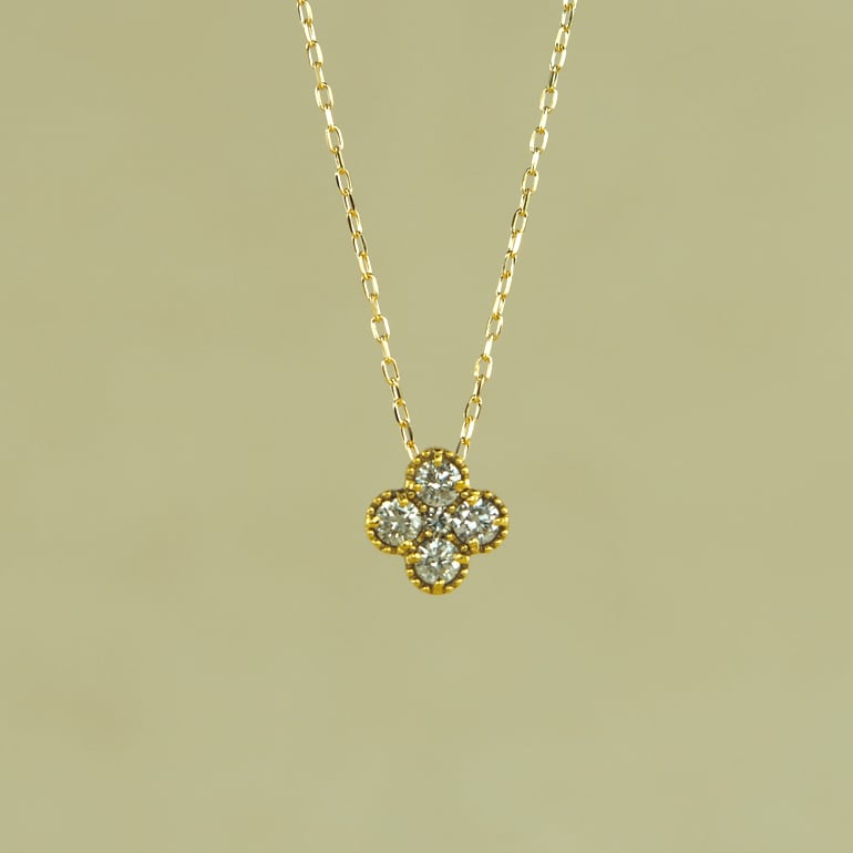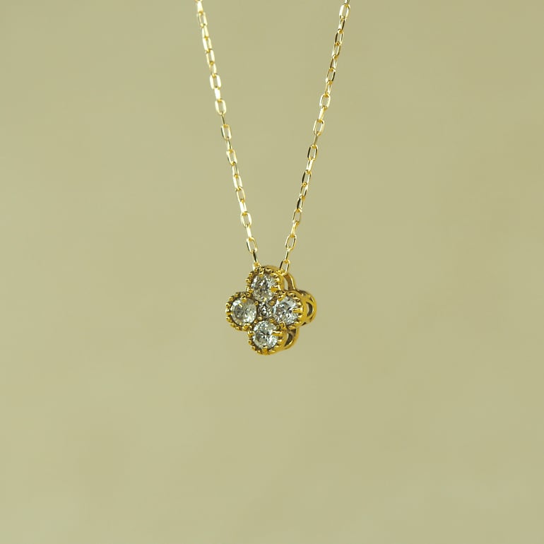 クラシックな趣と華やかな輝きが融合したデザインは、繊細なミル打ち加工を全体に施され、ダイアモンドと共に四葉のクローバーモチーフが魅力的に輝きます。クラシックなデザインながらも、洗練された雰囲気が漂うネックレスは、どんなコーディネートにも華を添えてくれることでしょう。贈る相手に幸運と幸せをもたらすとされる四葉のクローバー。その持つ特別な意味を込めて。