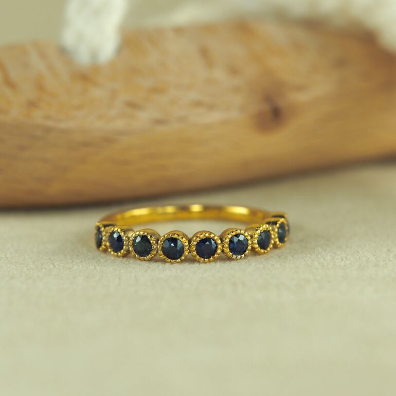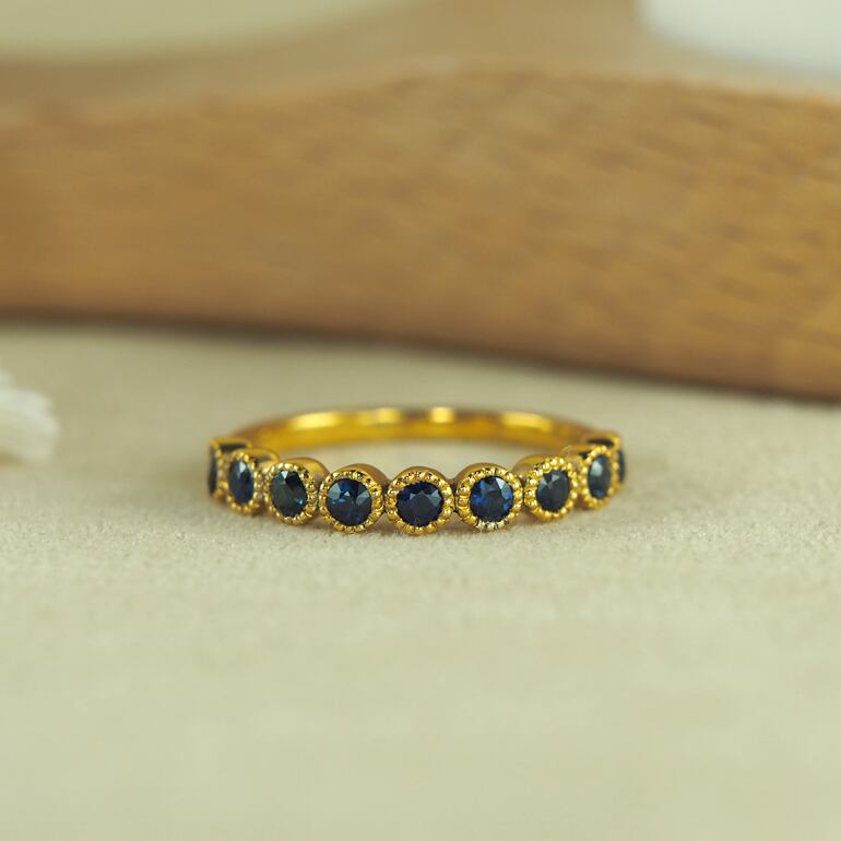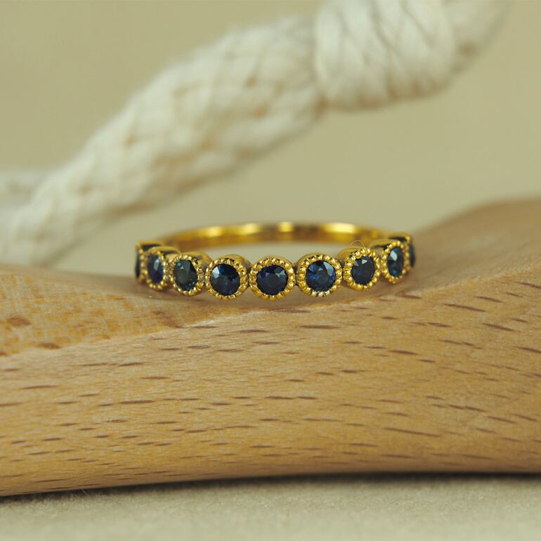 クラシックでエレガントな印象を与えてくれる指輪。ミル打ち加工によって細やかな装飾が施され、指輪に立体感とアンティーク風の美しさを感じさせます。ブルーサファイアの深い青色と細かい装飾が調和することでより高級感のある仕上がりになっています。