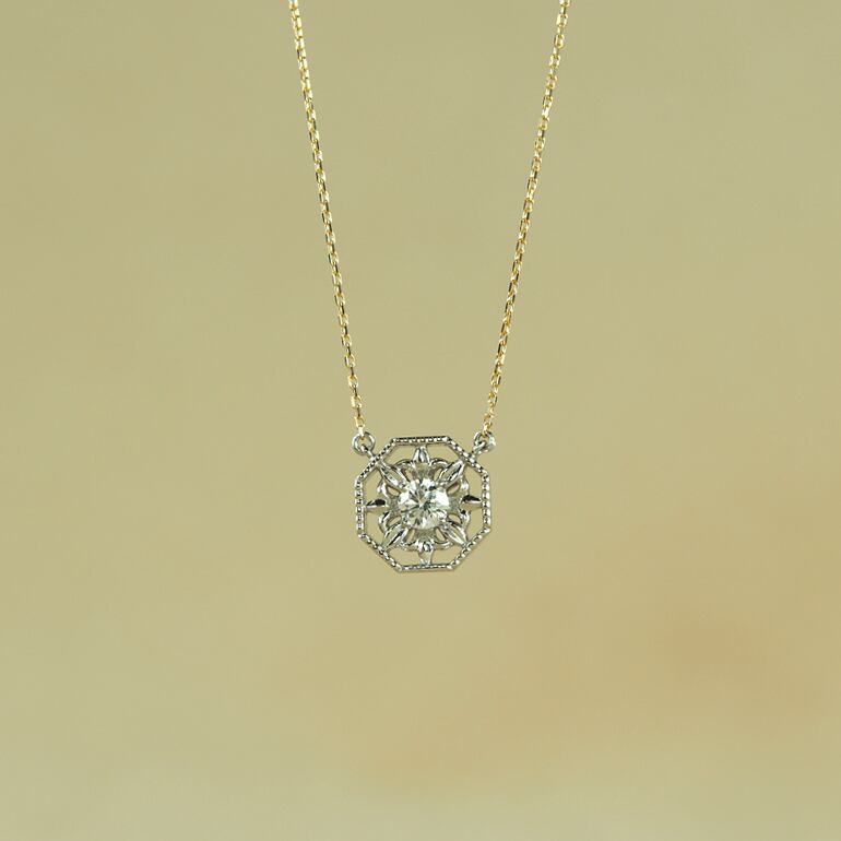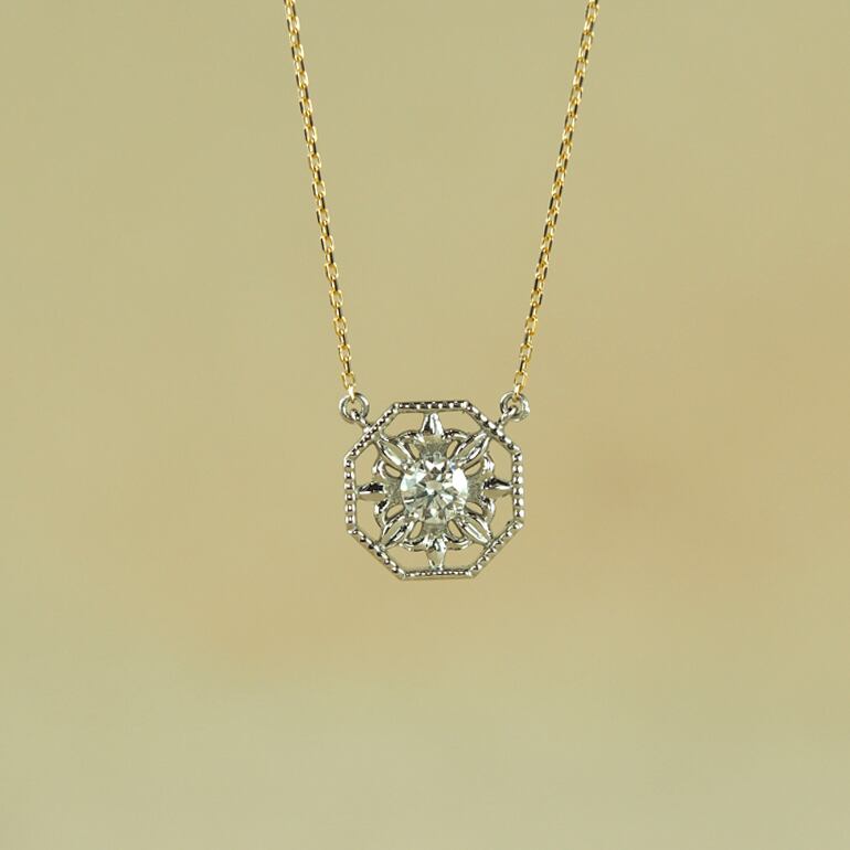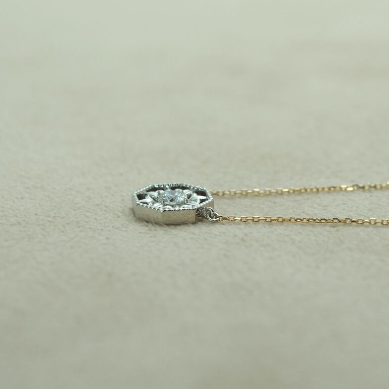 とても繊細でクラシックな美しさのあるネックレス。中央に輝くダイヤモンドが、その周囲を囲むレース模様と相まってとても優雅です。八角形のフレーム内に繊細な透かし細工が施されており、中央のダイヤモンドを引き立てています。レース柄のデザインがアクセントとなっており、全体的にクラシカルな雰囲気が強く、ヴィンテージ感も漂っています。シンプルながらも高級感があり、フォーマルなシーンでもカジュアルなシーンでも合わせやすいでしょう。